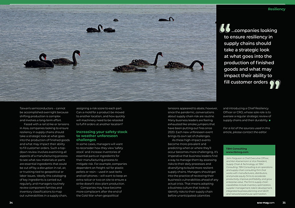 Faced with a rail strike or tensions in Asia , companies looking to ensure resiliency in supply chains should take a strategic look at what goes into the production of finished goods and what may impact their ability to fill customer orders . Such a topdown review involves examining all aspects of a manufacturing process to see what raw materials or parts are essential ingredients that could be cut off by a disruption in rail , air , or trucking tied to geopolitical or labor issues . Ideally , this cataloging of key ingredients is carried out regularly , and managers routinely review component families and inventory classifications to map out vulnerabilities in a supply chain ,