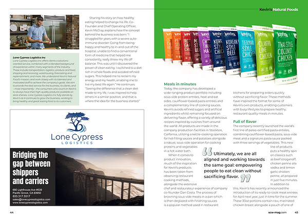 Today , the company has developed a wide-ranging product portfolio including sous-vide protein entrées , heat and eat sides , cauliflower-based pasta entrées and a complementary line of cooking sauces . Kevin ’ s avoids refined sugars and artificial ingredients whilst remaining focused on delivering flavor , offering a variety of delicious recipes inspired by cuisines from around the world . All products are made in the company production facilities in Stockton , California , utilizing a kettle-cooking operation for hot-filling sauces and potatoes alongside a robust , sous-vide operation for cooking proteins and vegetables in a hot water bath .