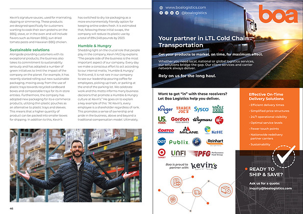 Alongside providing customers with its exceptional products , the business also takes its commitment to sustainability seriously and has adopted a number of green initiatives to limit the impact of the company on the planet . For example , it has recently started rolling out new sustainable packaging , moving away from the use of plastic trays towards recycled cardboard boxes and compostable trays for its in-store entrées . Furthermore , the company has adopted new packaging for its e-commerce products , utilizing thin plastic pouches as an alternative to plastic trays and sleeves . This means that a higher quantity of product can be packed into smaller boxes for shipping . In addition to this , Kevin ’ s has switched to dry ice packaging as a more environmentally friendly option for keeping online orders fresh . It is estimated that , following these initial swaps , the company will reduce its plastic use by a total of 894,548 pounds by 2023 .
