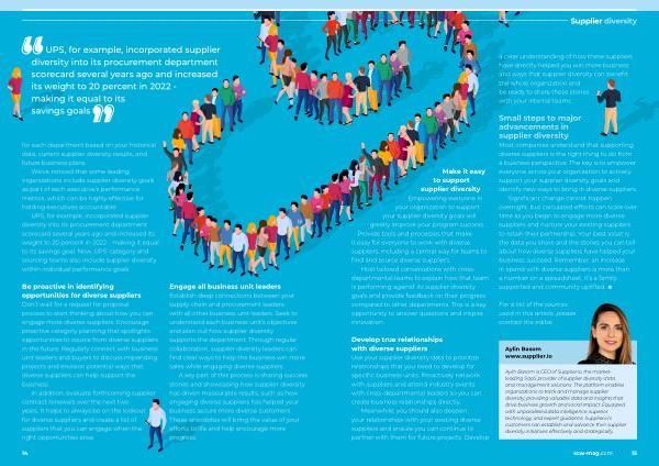 Significant change cannot happen overnight , but calculated efforts can scale over time as you begin to engage more diverse suppliers and nurture your existing suppliers to retain their partnership . Your best asset is the data you share and the stories you can tell about how diverse suppliers have helped your business succeed . Remember : an increase in spend with diverse suppliers is more than a number on a spreadsheet , it ’ s a family supported and community uplifted . ■