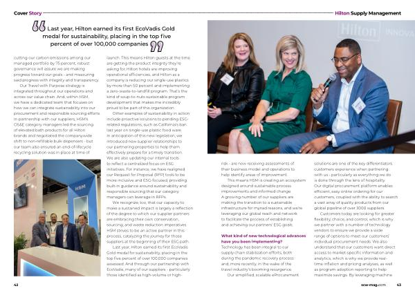 Our Travel with Purpose strategy is integrated throughout our operations and across our value chain . And , within HSM , we have a dedicated team that focuses on how we can integrate sustainability into our procurement and responsible sourcing efforts . In partnership with our suppliers , HSM ’ s OS & E category managers led the sourcing of elevated bath products for all Hilton brands and negotiated the companywide shift to non-refillable bulk dispensers - but our team also ensured an end-of-lifecycle recycling solution was in place at time of launch . This means Hilton guests at the time are getting the product integrity they ’ re asking for , Hilton hotels are improving operational efficiencies , and Hilton as a company is reducing our single-use plastics by more than 50 percent and implementing a zero-waste-to-landfill program . That ’ s the kind of soup-to-nuts sustainable program development that makes me incredibly proud to be part of this organization .
