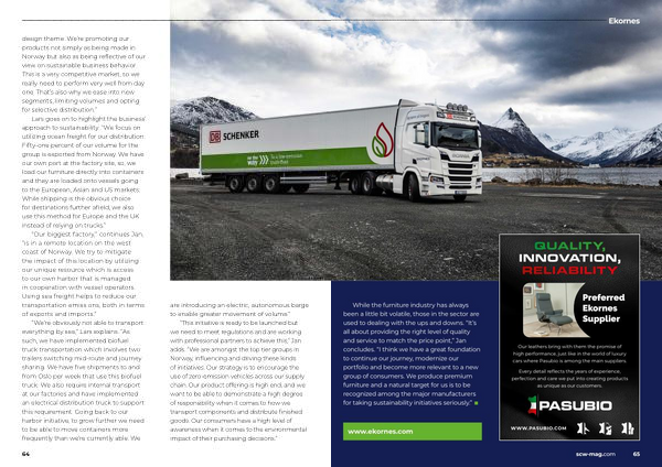 Lars goes on to highlight the business ’ approach to sustainability . “ We focus on utilizing ocean freight for our distribution . Fifty-one percent of our volume for the group is exported from Norway . We have our own port at the factory site , so , we load our furniture directly into containers and they are loaded onto vessels going to the European , Asian and US markets . While shipping is the obvious choice for destinations further afield , we also use this method for Europe and the UK instead of relying on trucks .”