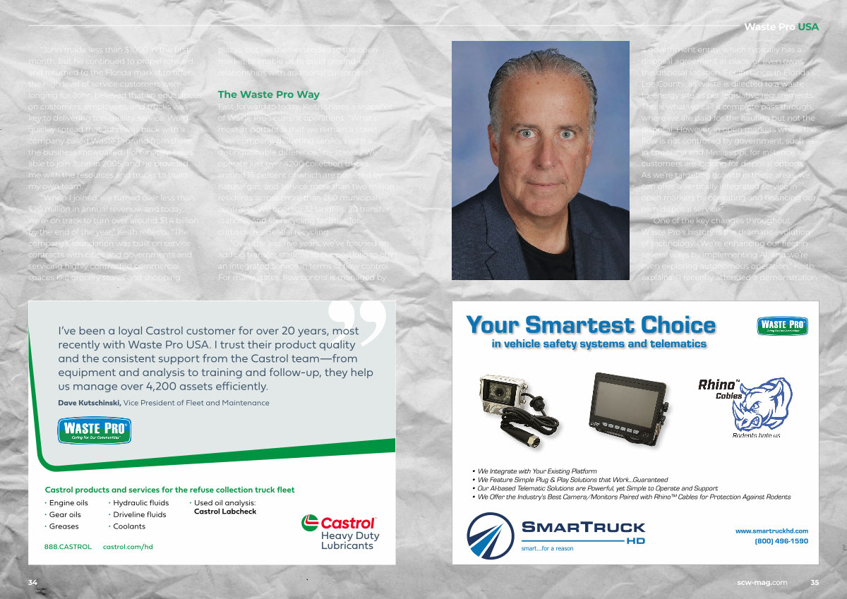 One of the key changes throughout Waste Pro’ s history is the dramatic evolution of technology.“ We’ re enhancing our fleet in several ways by implementing AI, and we’ re even exploring autonomous operation,” Keith explains.“ I recently attended a demonstration