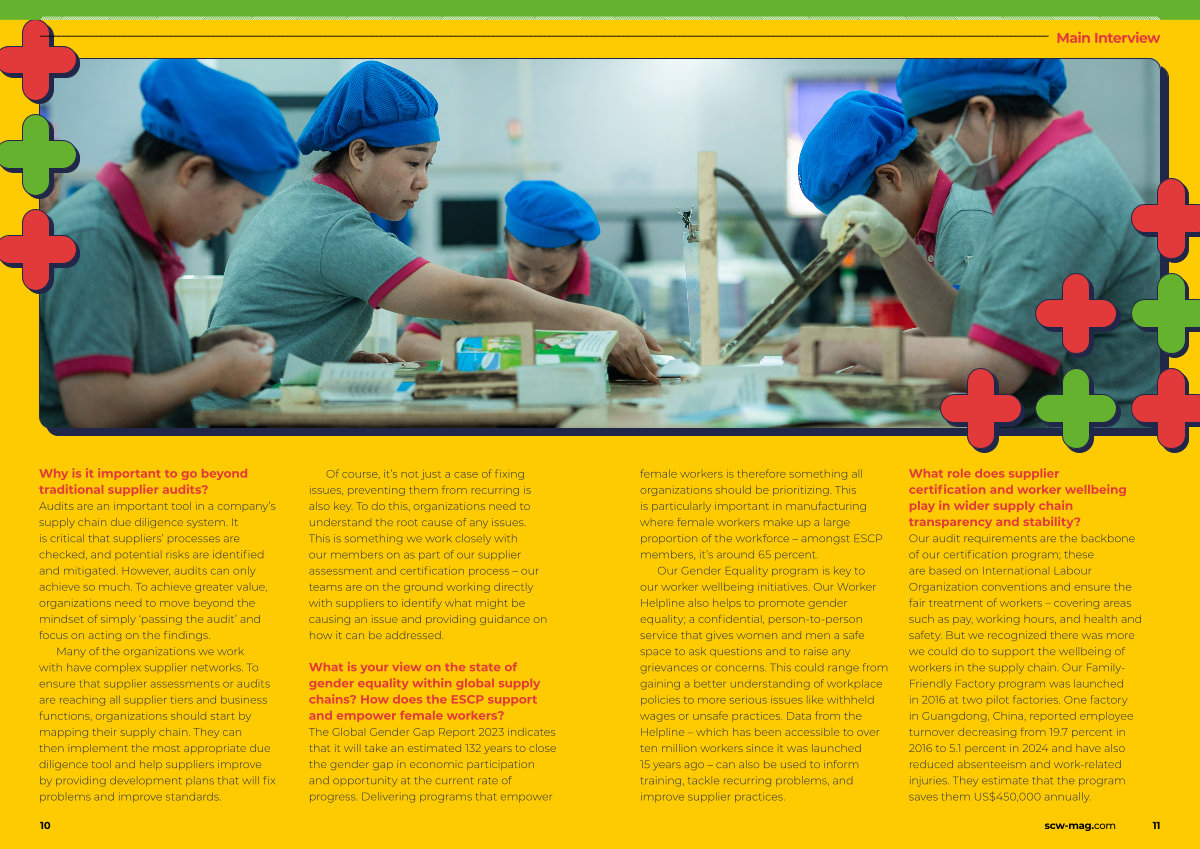 What role does supplier certification and worker wellbeing play in wider supply chain transparency and stability? Our audit requirements are the backbone of our certification program; these are based on International Labour Organization conventions and ensure the fair treatment of workers – covering areas such as pay, working hours, and health and safety. But we recognized there was more we could do to support the wellbeing of workers in the supply chain. Our Family- Friendly Factory program was launched in 2016 at two pilot factories. One factory in Guangdong, China, reported employee turnover decreasing from 19.7 percent in 2016 to 5.1 percent in 2024 and have also reduced absenteeism and work-related injuries. They estimate that the program saves them US $ 450,000 annually.