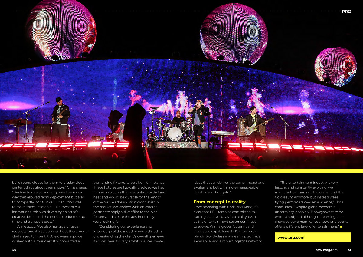 build round globes for them to display video content throughout their shows,” Chris shares.“ We had to design and engineer them in a way that allowed rapid deployment but also fit compactly into trucks. Our solution was to make them inflatable. Like most of our innovations, this was driven by an artist’ s creative desire and the need to reduce setup time and transport costs.”