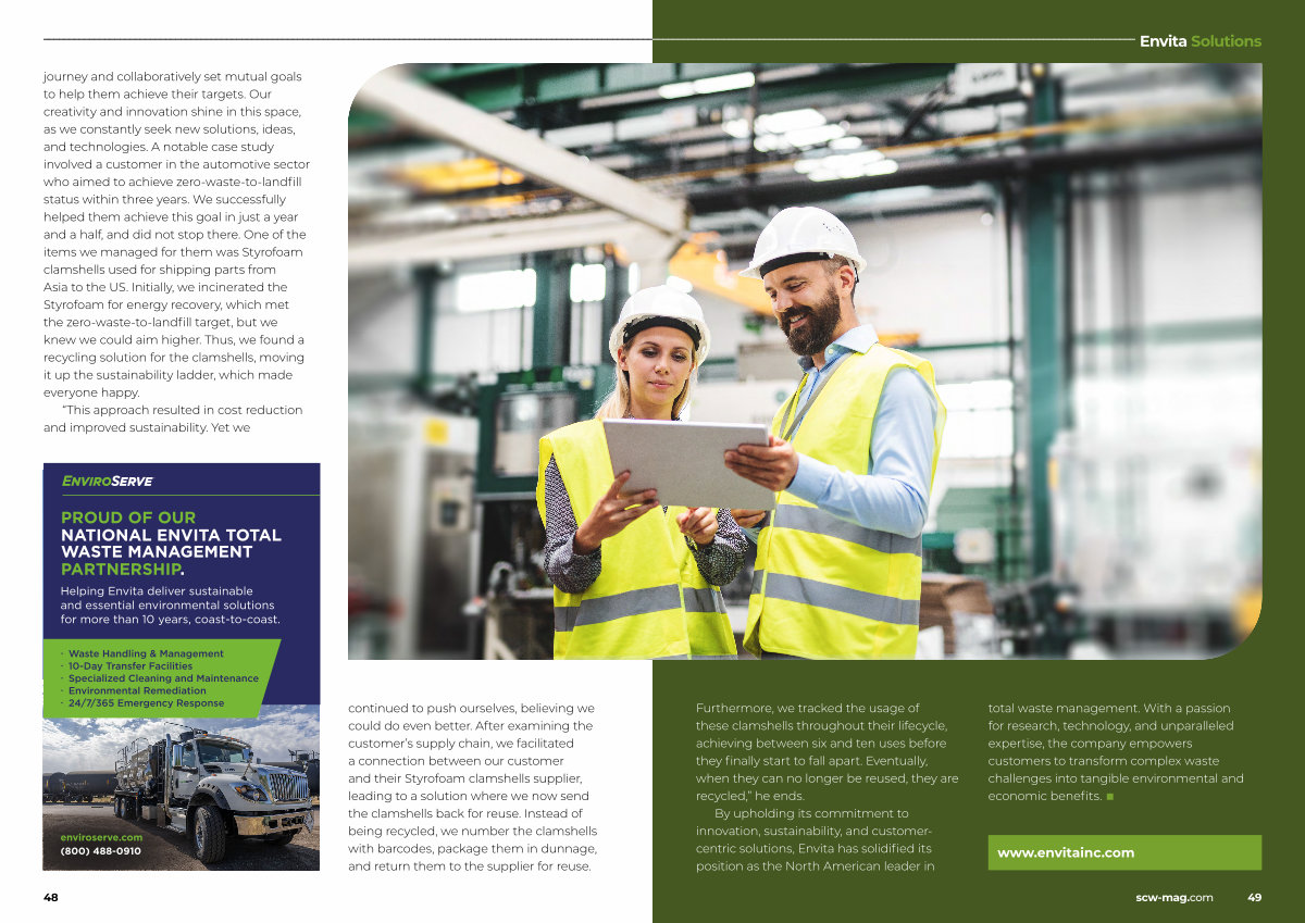 enviroserve. com( 800) 488-0910 continued to push ourselves, believing we could do even better. After examining the customer’ s supply chain, we facilitated a connection between our customer and their Styrofoam clamshells supplier, leading to a solution where we now send the clamshells back for reuse. Instead of being recycled, we number the clamshells with barcodes, package them in dunnage, and return them to the supplier for reuse.