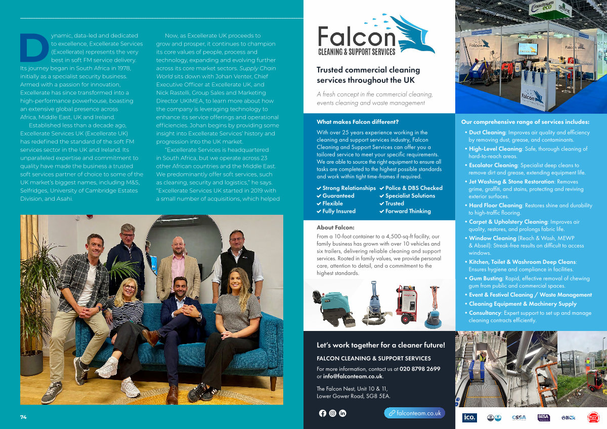 “ Excellerate Services is headquartered in South Africa, but we operate across 23 other African countries and the Middle East. We predominantly offer soft services, such as cleaning, security and logistics,” he says.“ Excellerate Services UK started in 2019 with a small number of acquisitions, which helped
