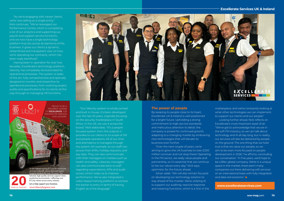Looking further ahead, Nick reflects on Excellerate’ s most important asset of all.“ We’ ve got to acknowledge that we are in the soft FM industry, so we can talk about technology and AI all day long, but in reality, our services will also be delivered by people on the ground. The one thing that we hold true is that we value our people, so we aim to be even more focused on people development in 2026,” he affirms, concluding our conversation.“ In five years, we’ d hope to be a $ 1bn global company. We’ re in a unique space in the market; there aren’ t many companies out there delivering soft services on an international basis with fully integrated and data-led solutions.” ■