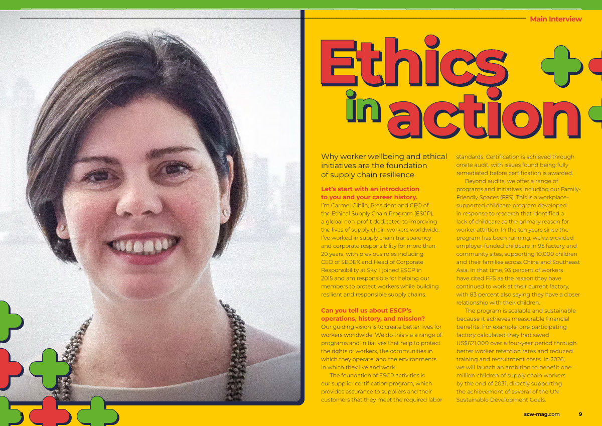 Let’ s start with an introduction to you and your career history. I’ m Carmel Giblin, President and CEO of the Ethical Supply Chain Program( ESCP), a global non-profit dedicated to improving the lives of supply chain workers worldwide. I’ ve worked in supply chain transparency and corporate responsibility for more than 20 years, with previous roles including CEO of SEDEX and Head of Corporate Responsibility at Sky. I joined ESCP in 2015 and am responsible for helping our members to protect workers while building resilient and responsible supply chains.