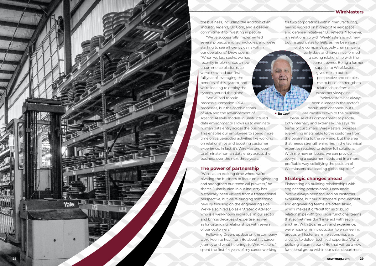 ▲ Bo Corn for two corporations within manufacturing, having worked on high-profile aerospace and defense initiatives,” Bo reflects.“ However, my relationship with WireMasters is not new, but instead dates to 1988, as I’ ve been part of the company’ s supply chain since its early days and have since formed a strong relationship with the current owner. Being a former supplier to WireMasters gives me an outsider perspective and enables me to build or strengthen relationships from a customer viewpoint.