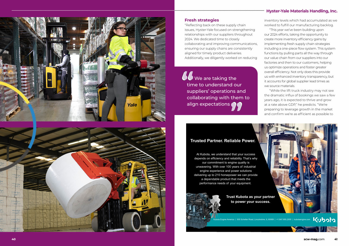 “ Reflecting back on these supply chain issues, Hyster-Yale focused on strengthening relationships with our suppliers throughout 2024. We dedicated time to closely collaborating and improving communications, ensuring our supply chains are consistently aligned for timely product deliveries. Additionally, we diligently worked on reducing