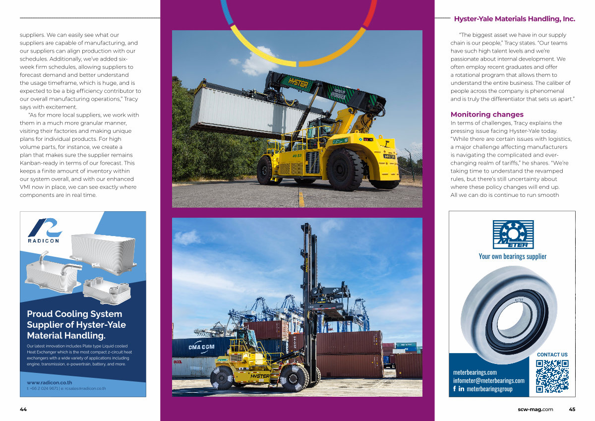 In terms of challenges, Tracy explains the pressing issue facing Hyster-Yale today.“ While there are certain issues with logistics, a major challenge affecting manufacturers is navigating the complicated and everchanging realm of tariffs,” he shares.“ We’ re taking time to understand the revamped rules, but there’ s still uncertainty about where these policy changes will end up. All we can do is continue to run smooth
