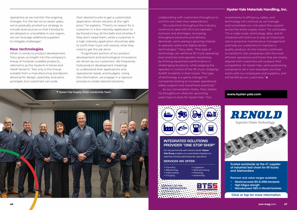 investments in efficiency, safety, and technology will continue as we manage and consolidate our one-piece flow system across the entire supply chain,” he concludes.“ On a wider scale, technology, data, and AI initiatives will continue to play an important role in proactive maintenance management and help our customers to maintain a quality product. As the industry continues to transform, the companies with the most efficient operations and those that are closely aligned with customers will outpace their competitors. At Hyster-Yale, we’ re positioning ourselves to set a new standard, one that starts with our employees and suppliers, and will be felt by our customers.” ■