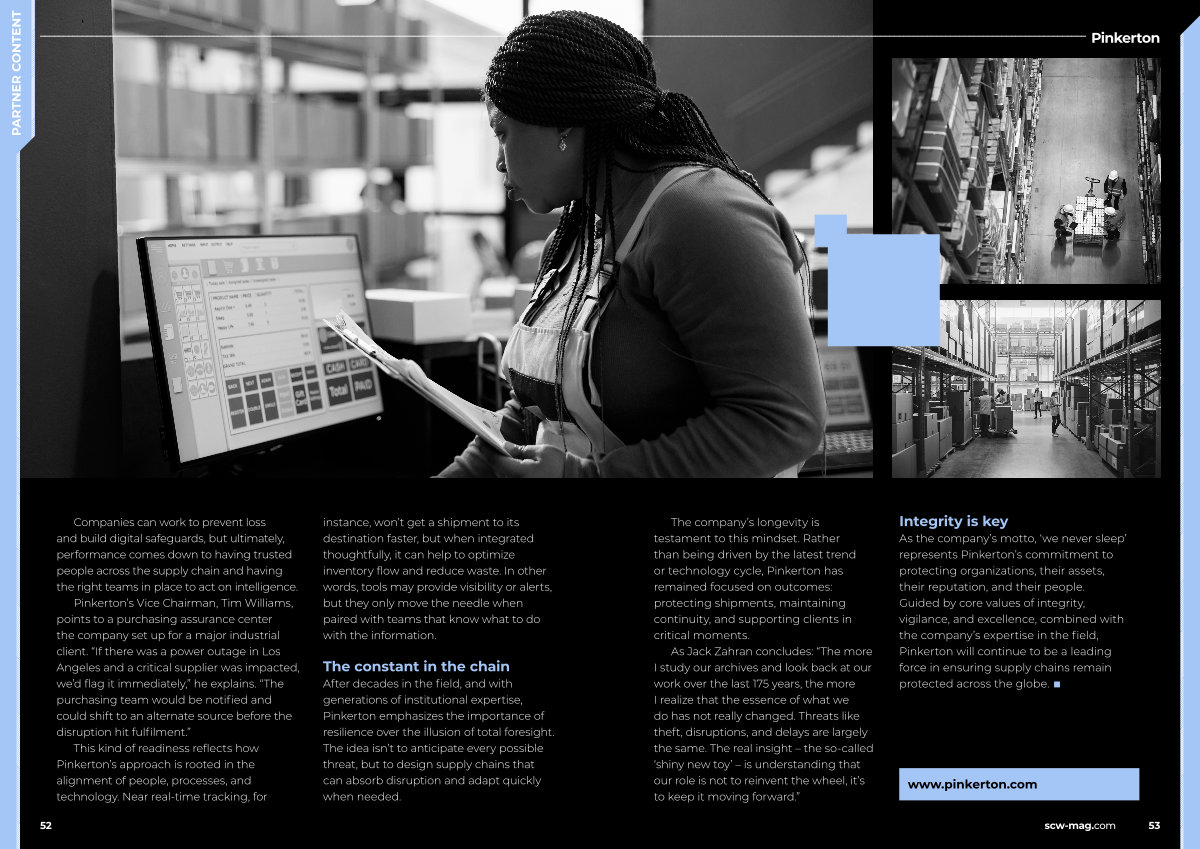 As the company’ s motto,‘ we never sleep’ represents Pinkerton’ s commitment to protecting organizations, their assets, their reputation, and their people. Guided by core values of integrity, vigilance, and excellence, combined with the company’ s expertise in the field, Pinkerton will continue to be a leading force in ensuring supply chains remain protected across the globe. ■