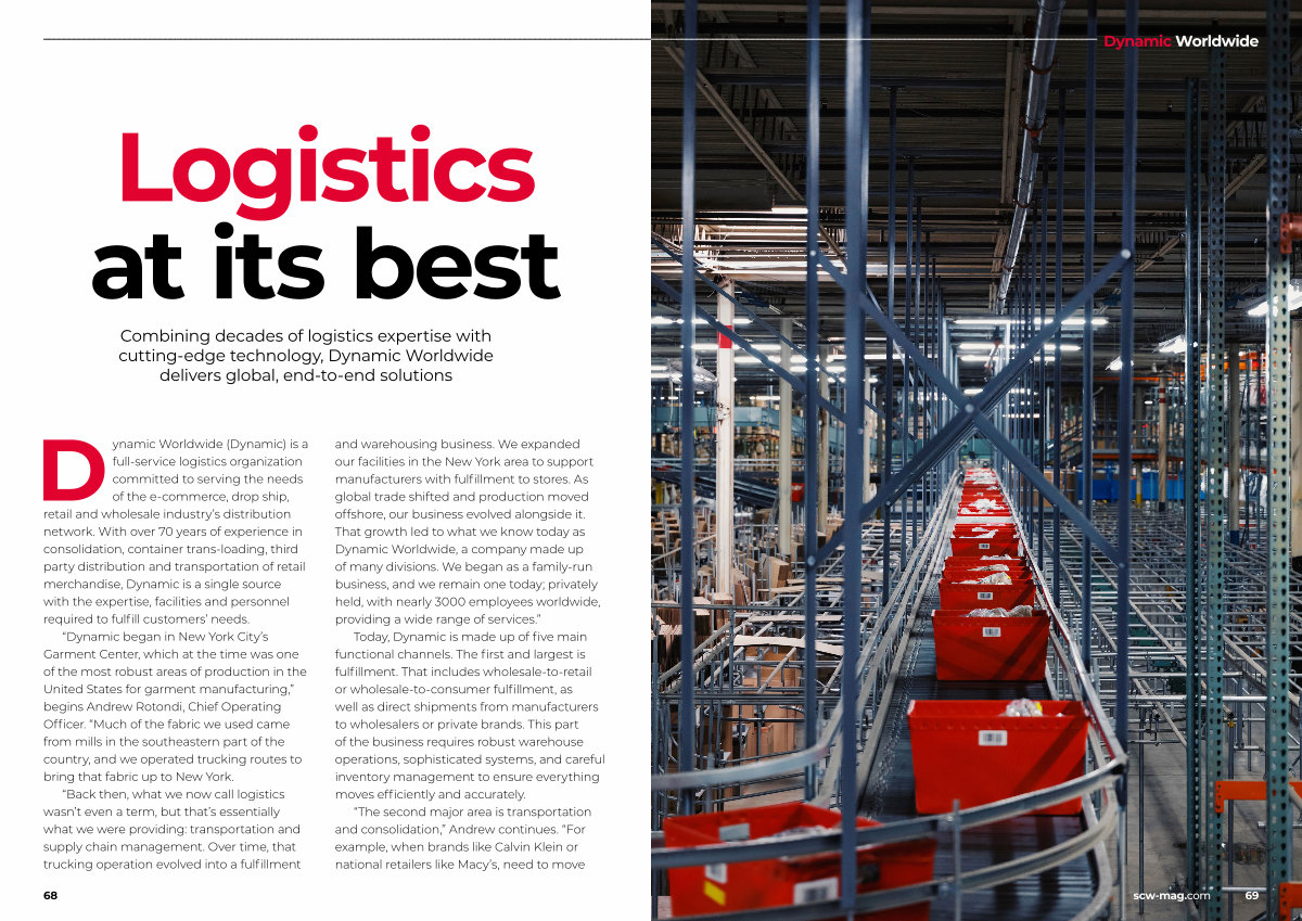 “ Back then, what we now call logistics wasn’ t even a term, but that’ s essentially what we were providing: transportation and supply chain management. Over time, that trucking operation evolved into a fulfillment and warehousing business. We expanded our facilities in the New York area to support manufacturers with fulfillment to stores. As global trade shifted and production moved offshore, our business evolved alongside it. That growth led to what we know today as Dynamic Worldwide, a company made up of many divisions. We began as a family-run business, and we remain one today; privately held, with nearly 3000 employees worldwide, providing a wide range of services.”