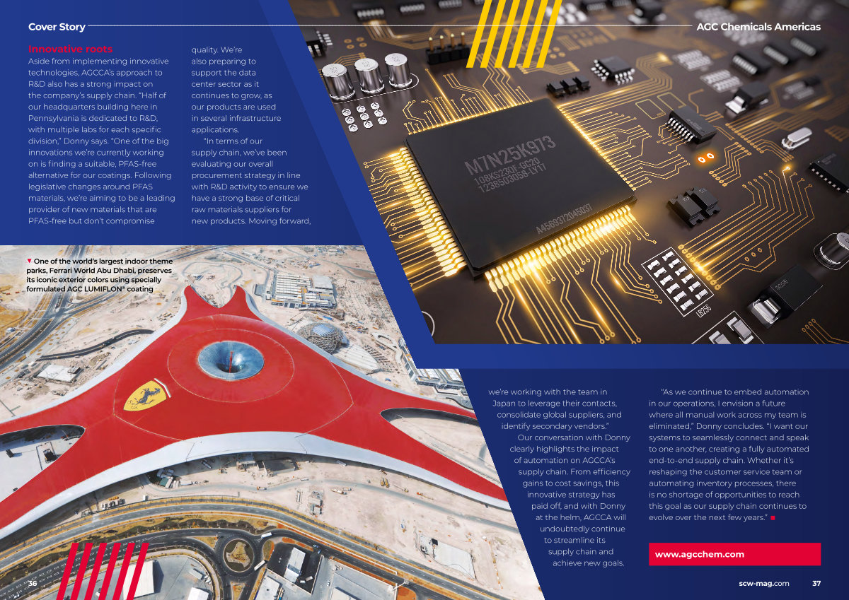 Aside from implementing innovative technologies, AGCCA’ s approach to R & D also has a strong impact on the company’ s supply chain.“ Half of our headquarters building here in Pennsylvania is dedicated to R & D, with multiple labs for each specific division,” Donny says.“ One of the big innovations we’ re currently working on is finding a suitable, PFAS-free alternative for our coatings. Following