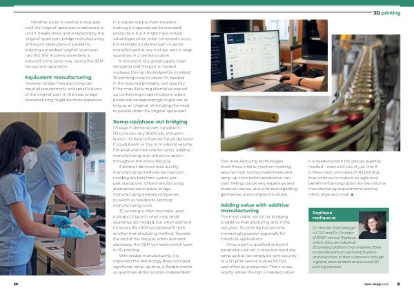 Dr . Henrike Wonneberger is COO and Co-Founder of BASF-owned , Replique , which offers an industrial 3D printing platform that enables OEMs to provide parts on-demand anytime and anywhere to their customers through a global , decentralized and secured 3D printing network . scw-mag . com 21