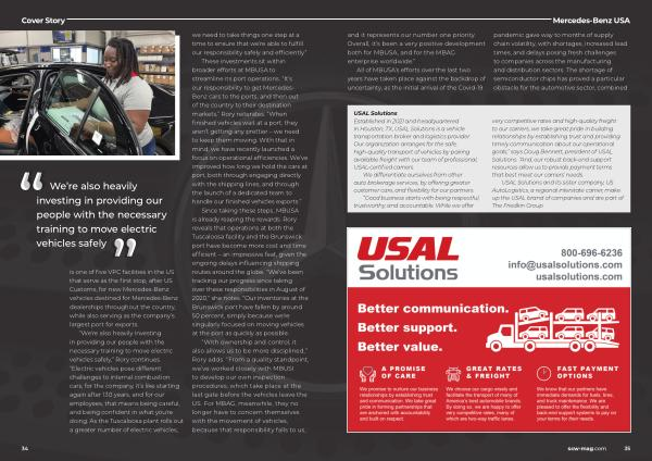 These investments sit within broader efforts at MBUSA to streamline its port operations . “ It ’ s our responsibility to get Mercedes- Benz cars to the ports , and then out of the country to their destination markets ,” Rory reiterates . “ When finished vehicles wait at a port , they aren ’ t getting any prettier – we need to keep them moving . With that in mind , we have recently launched a focus on operational efficiencies . We ’ ve improved how long we hold the cars at port , both through engaging directly with the shipping lines , and through the launch of a dedicated team to handle our finished vehicles exports .”