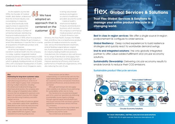 Flex Partnering for long-term customer value Flex is known as a product design and manufacturing powerhouse , and one of the world ’ s largest supply chain companies . Serving multiple industries , including the advanced medical technology and pharmaceutical sectors , the company also offers a range of integrated value-added services that are designed to optimize every aspect of a product ’ s journey , from design and manufacturing to delivery and aftermarket services .