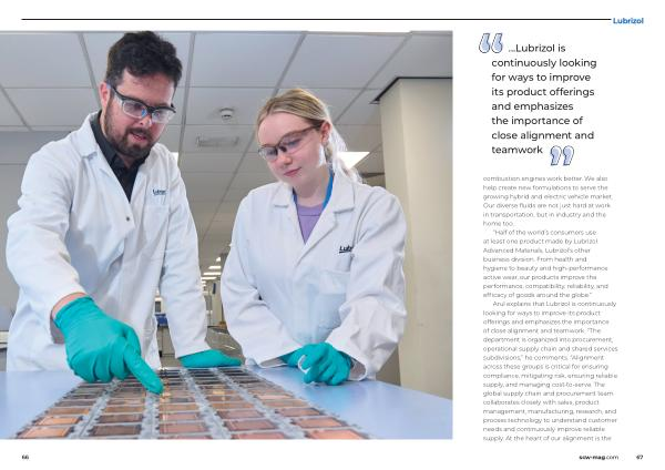 Arul explains that Lubrizol is continuously looking for ways to improve its product offerings and emphasizes the importance of close alignment and teamwork . “ The department is organized into procurement , operational supply chain and shared services subdivisions ,” he comments . “ Alignment across these groups is critical for ensuring compliance , mitigating risk , ensuring reliable supply , and managing cost-to-serve . The global supply chain and procurement team collaborates closely with sales , product management , manufacturing , research , and process technology to understand customer needs and continuously improve reliable supply . At the heart of our alignment is the