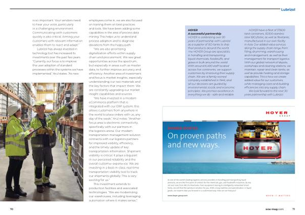 HOYER A successful partnership HOYER is celebrating over 30 years of partnership with Lubrizol as a supplier of ISO tanks to ship their products around the world . The HOYER Group are specialists in handling and transporting liquid chemicals , foodstuffs , and gases in bulk around the world . With around 6,400 staff located across five continents , we support customers by improving their supply chain . We are a family-owned company established in 1946 , and all our decisions are guided by environmental , social , and economic principles . We promise excellence in everything we do - safe and reliable .